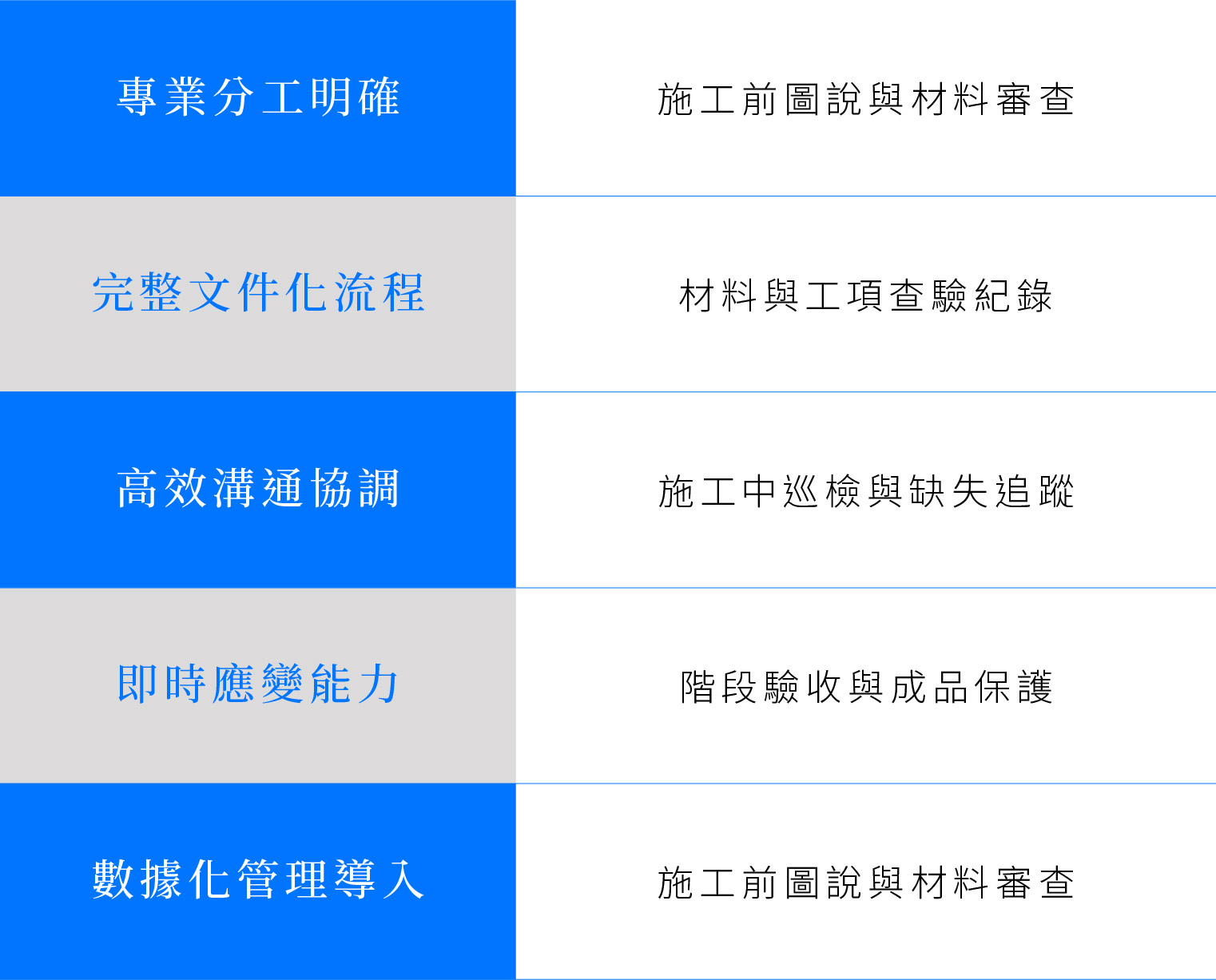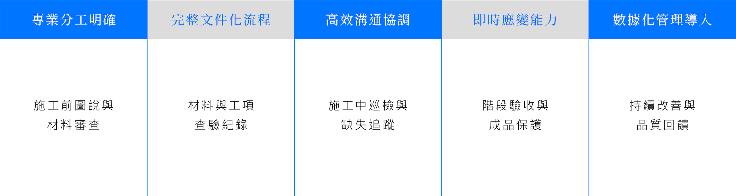 從材料進場到施工手法、接合精度與現場整潔,以工序為節點、以標準為底線,層層把關,構築出經得起時間與使用檢驗的建築。