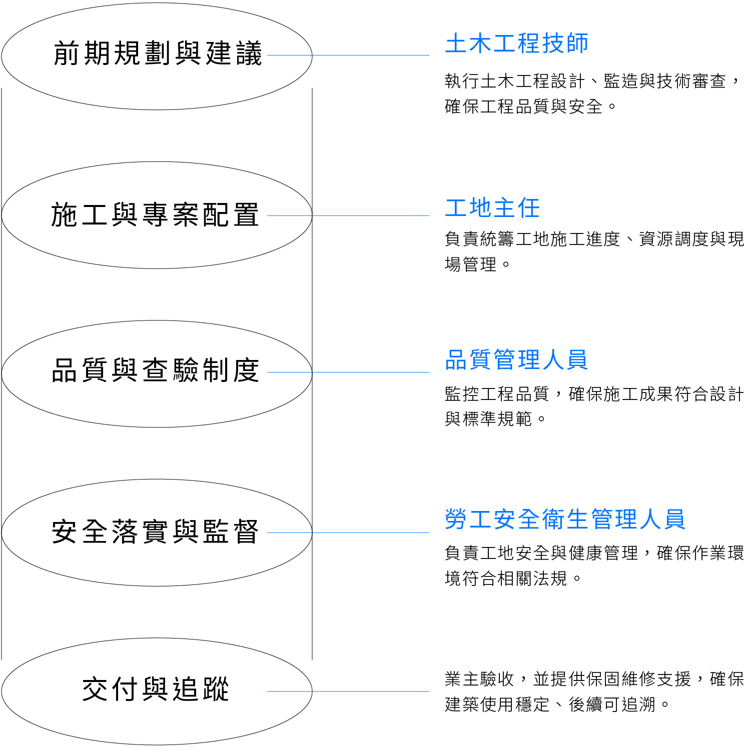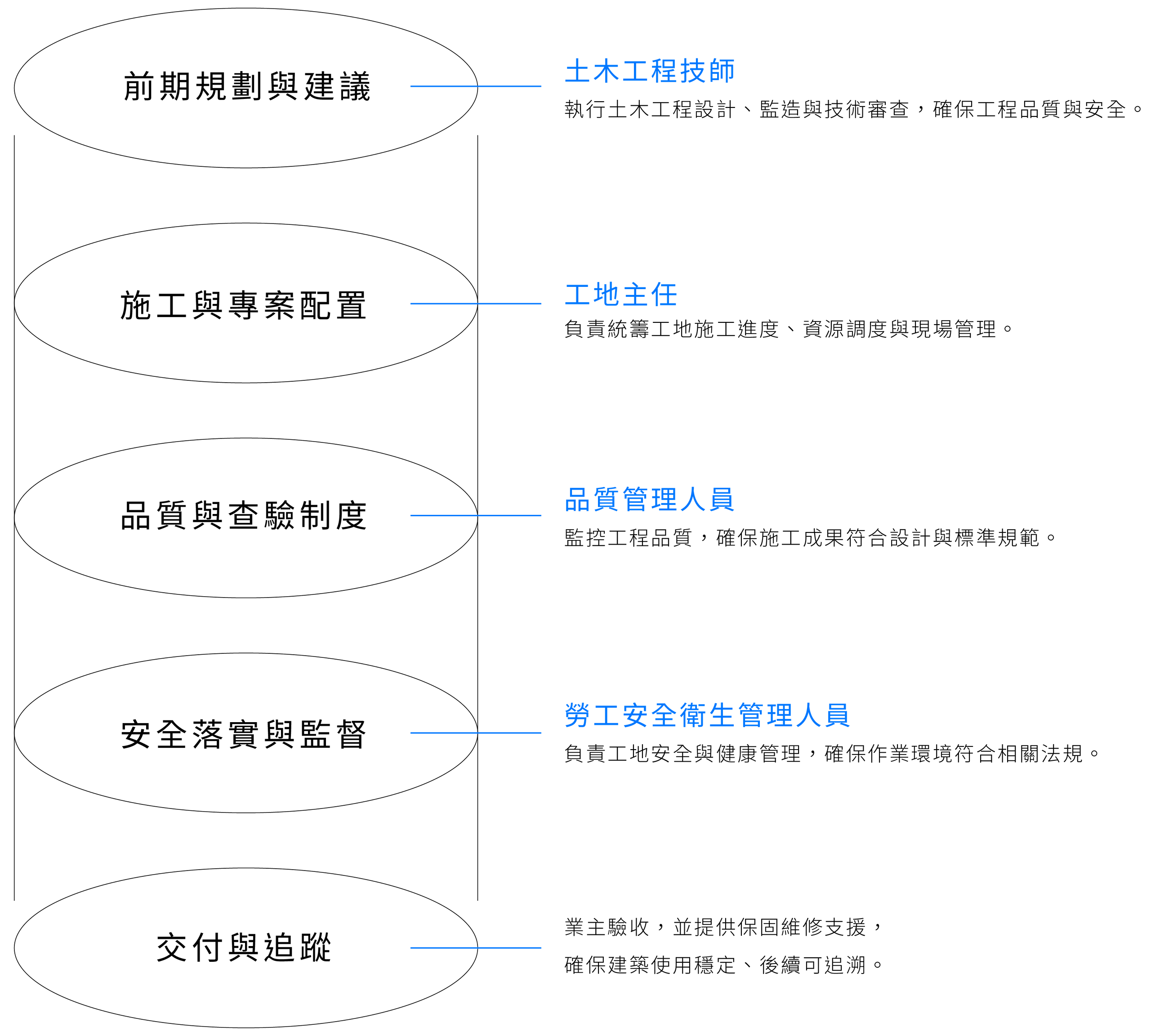 我們的專業團隊具備完善的職能配置,從前期規劃、設計審查、施工管理到完工驗收,於每個階段皆由具備相關專業證照的人員負責,確保品質控管不落空。